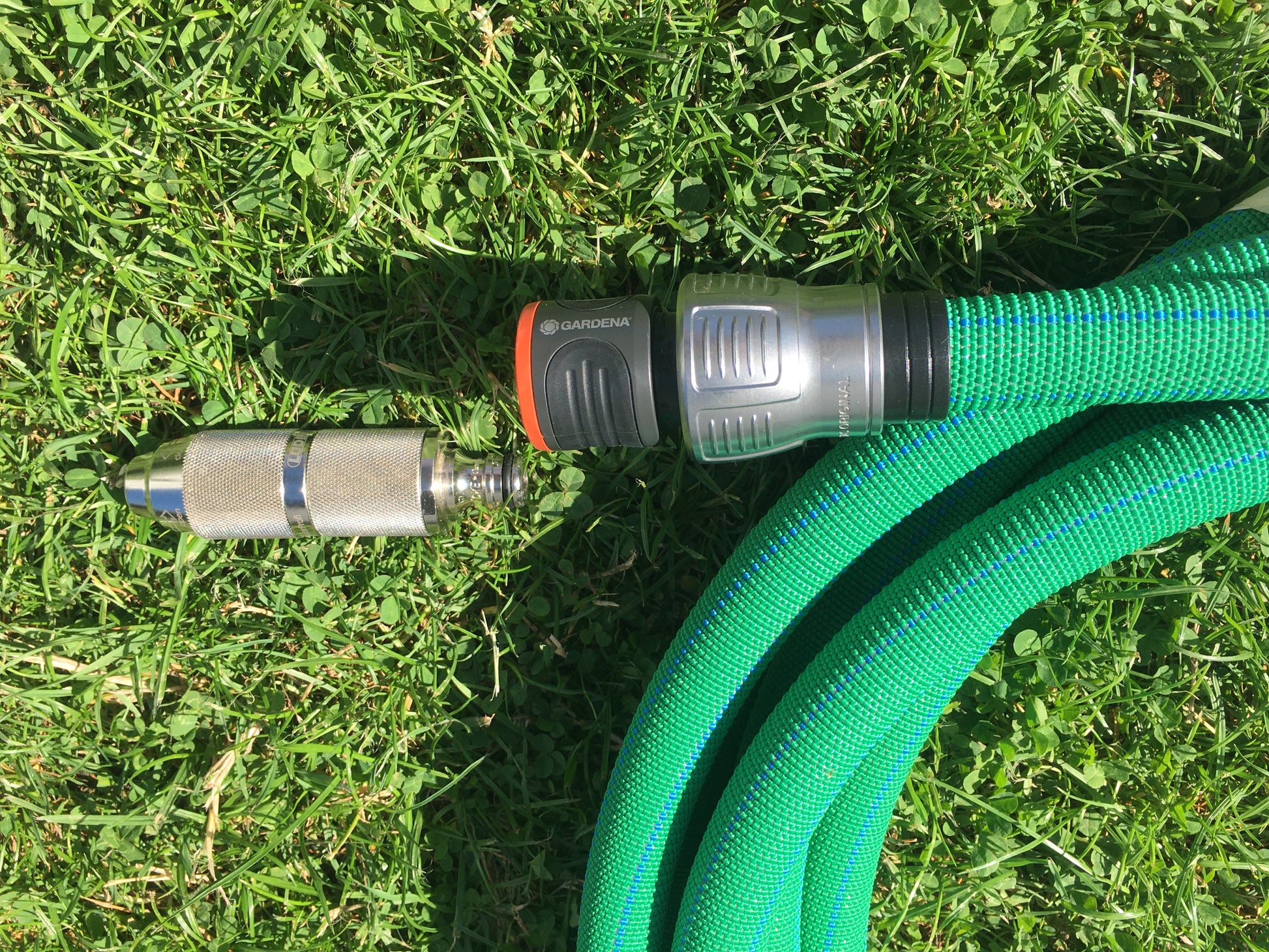 Durchmesser 3/4" - 19 mm mit hochwertiger EPDM-Gummierung, Gewebe aus 100% hochfestem synthetischen Polyestergarn mit speziell eingewebten Monofilament-Garn im Schuss, rundgewebt in Leinwandbindung, Kette und Schuss mehrfach gezwirnt, Farbe helles grün mit blauen Kettfäden, beiderseitig ohne Anschlüsse/Kupplungen. Das Video zeigt eine Anwendung als Saugschlauch, die drei letzten Bilder zeigen 3/4" Steckkupplungen von GARDENA.
