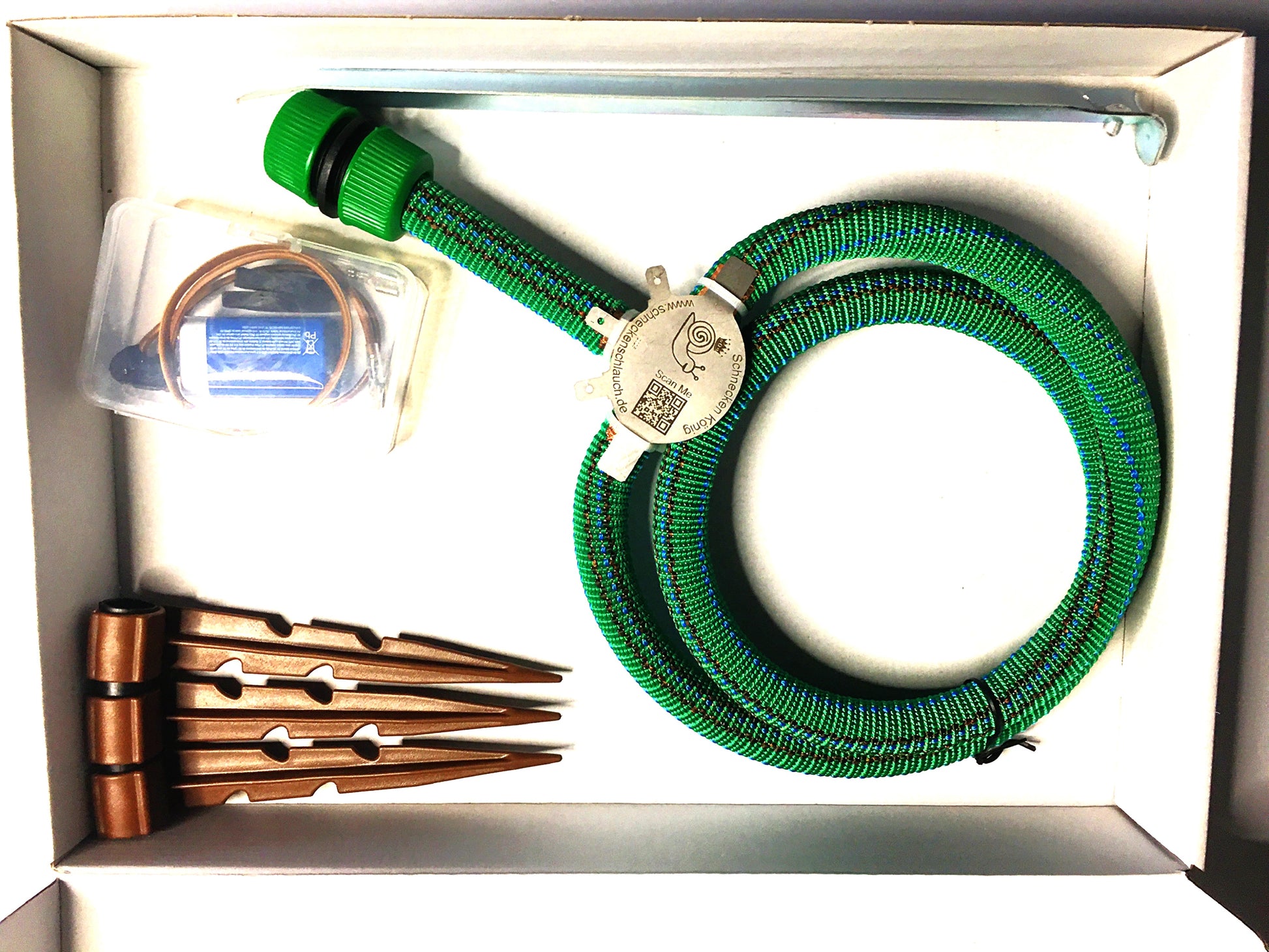 - 1 Stück Gewebe-Schneckenschlauch 1m (als Keis zusammengefügt, Durchmesser ca. 30 cm) mit Anschluss für Bewässerung und Batterie